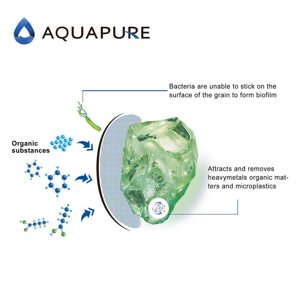 As a 100% bio-resistant filter media,it's self-sterilizing surface prevent bacterial growth.When its contact with water flowing through the filter, The water moleculed and dissoloved oxygen transformed into free radicals on the surface area of AFM(catalytic reaction). This helps to prevents bio fouling and protect from bacterial colonisation. Free radicals oxidise dissolved organic matter and heavy metals.